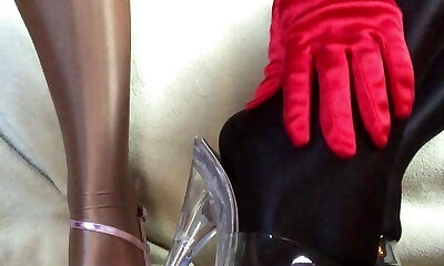 Sensual teasing close up legs and feet in Glossy shining pantyhose and high heels.